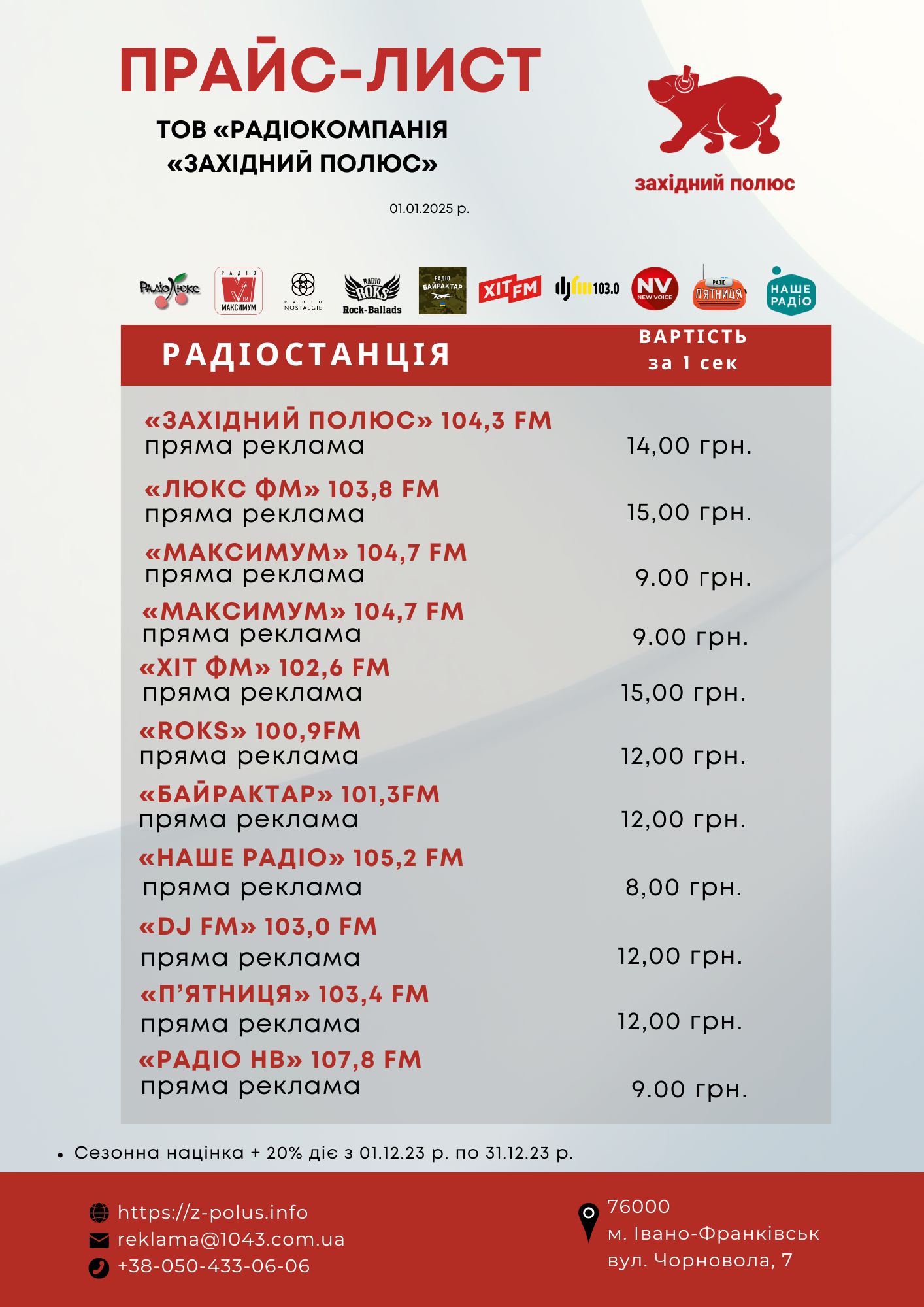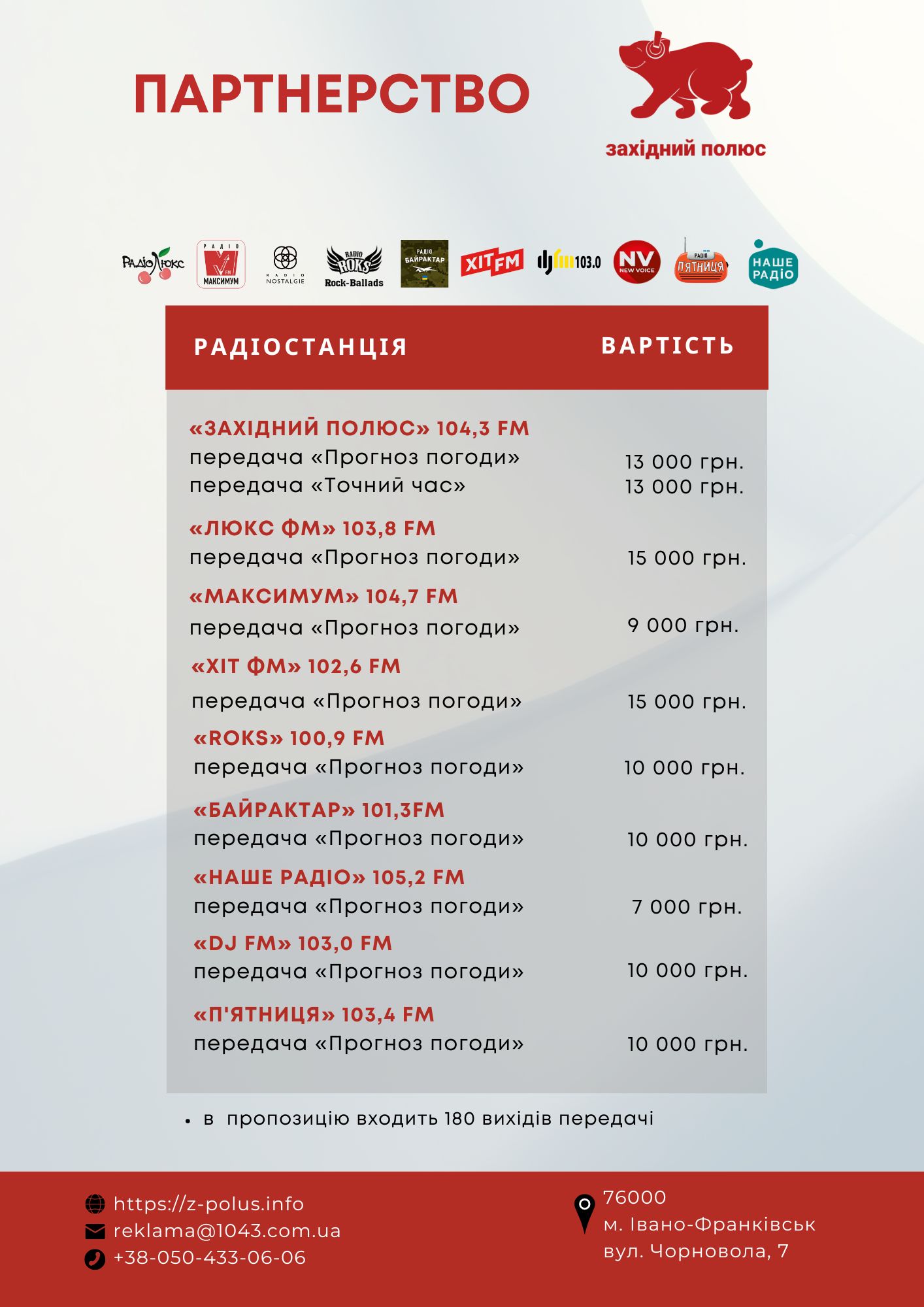 Рекламна агенція Західного полюсу також є ексклюзивним представником на Івано-Франківщині низки популярних українських радіомереж: