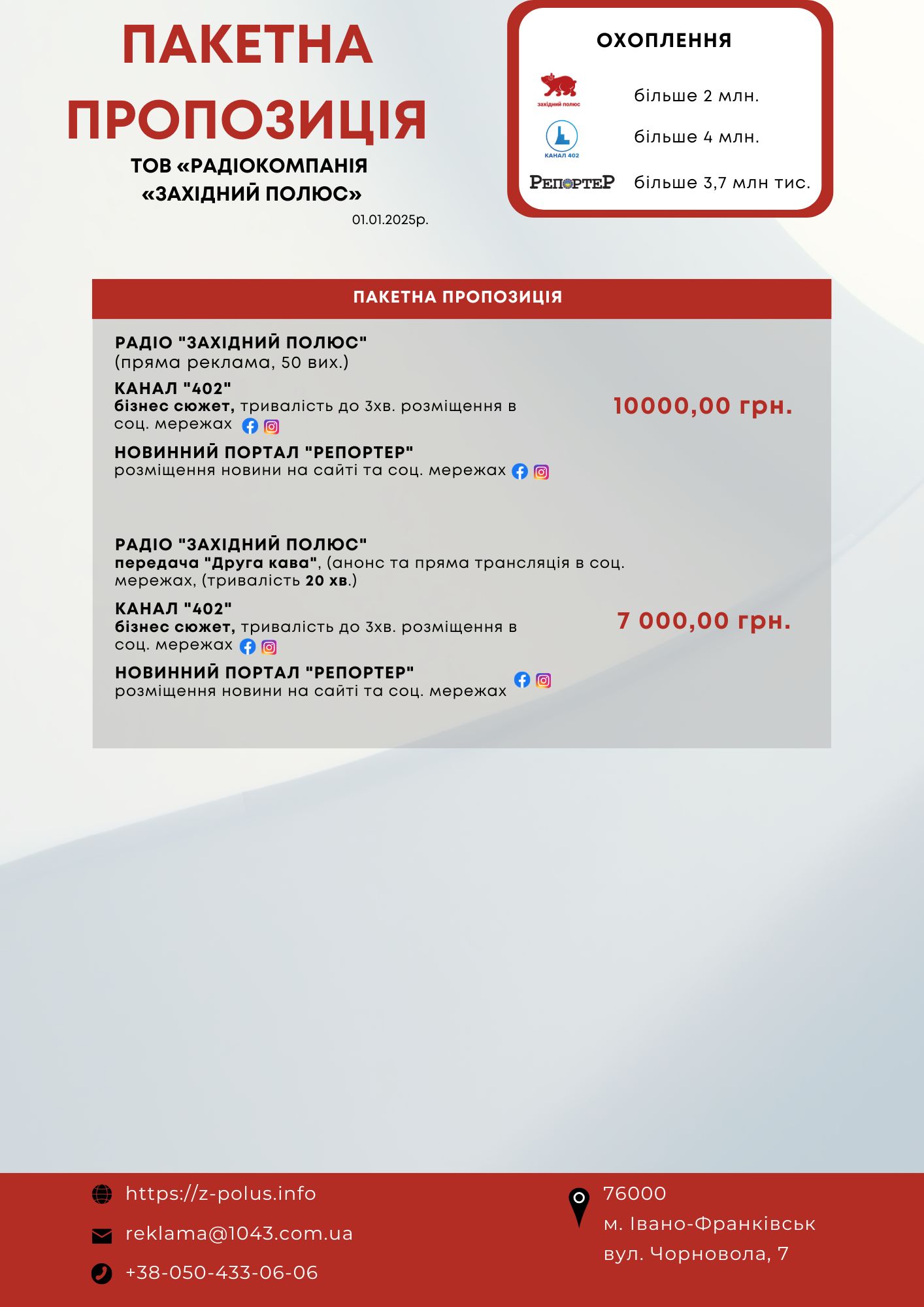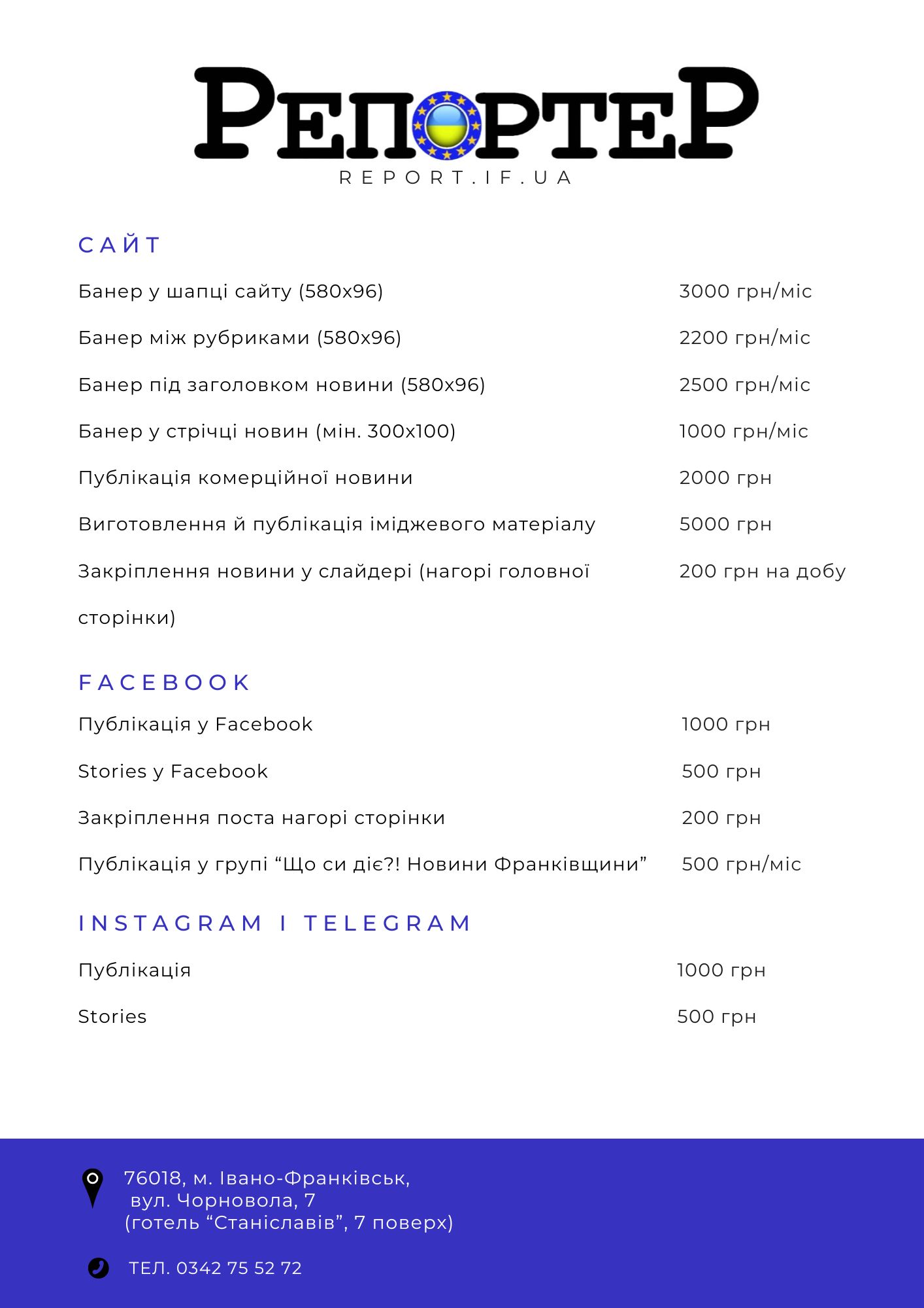 • Facebook, Instagram, Telegram. Так, на «Репортер» у Facebook підписані понад 40 тисяч користувачів соцмережі. Крім того, видання має власну групу – «Шо си діє? Новини Франківщини» – ще 15 тисяч прихильників. Загальне щомісячне охоплення – понад 2 млн. людей.